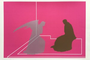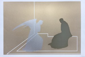 These screen-prints reduce three versions to their basic structure. The architecture is shown by white lines on a flat background. The virgin silhouette is printed with mud from the estuary of the river Lune, and the angel with transparent silver ink.