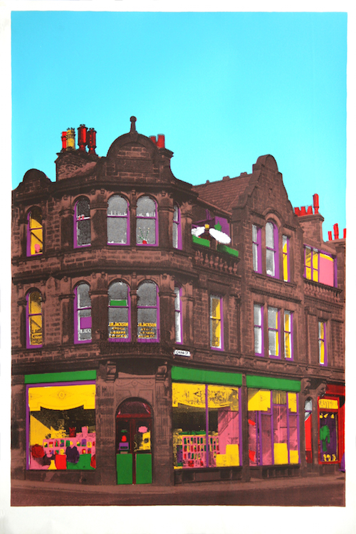 Colour development of a poster image for the band ‘China Street’, based on a photo I took. Two members of the band lived in the top floor flat of this building, one is visible on the balcony in top hat and wings. There was a haberdashery on the ground floor, and solicitors’ office on the first.