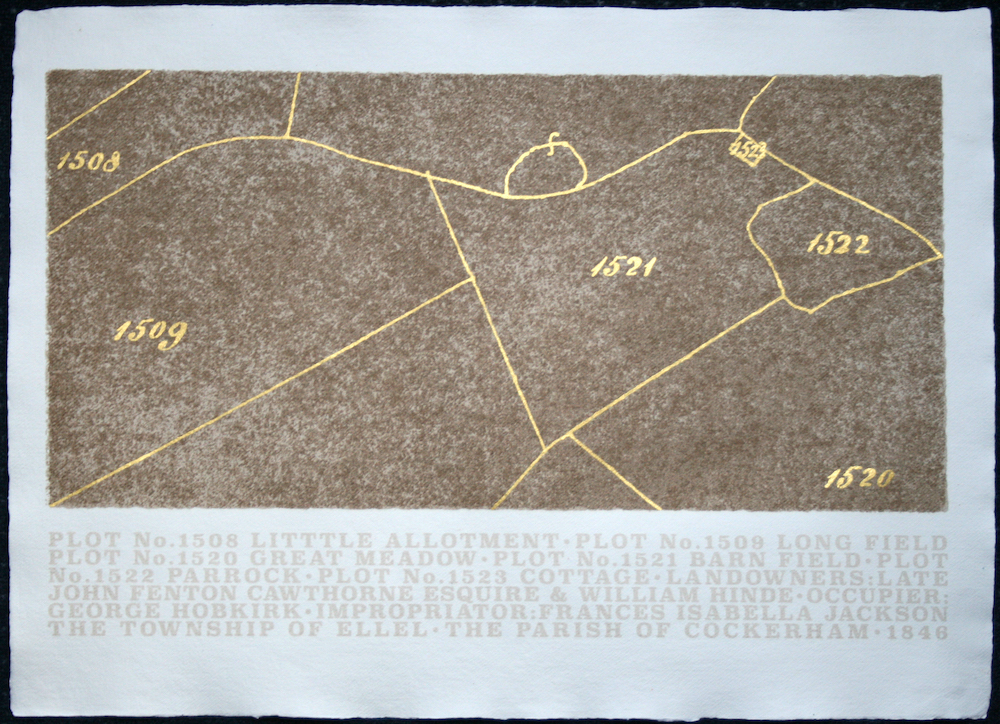 Previous Image Next Image Township of Ellel. 1846. Plot Nos 1508,1509,1520,1521,1522. Township of Ellel. 1846. Plot Nos 1508, 1509, 1520, 1521, 1522. Screen-printed in mud and gold acrylic, plus hand-painted gold. 56x76cm Khadi paper White 320g Rough 2023