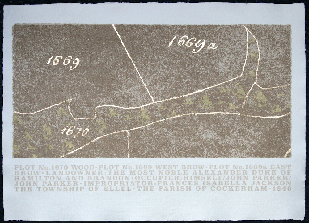 Previous Image Next Image Township of Ellel. 1846. Plot Nos. 1669,1669a,1670. Township of Ellel. 1846. Plot Nos. 1669, 1669a, 1670. Screen-printed in mud and gold acrylic, plus hand-painted gold. 56x76cm Khadi paper White 320g Rough 2023