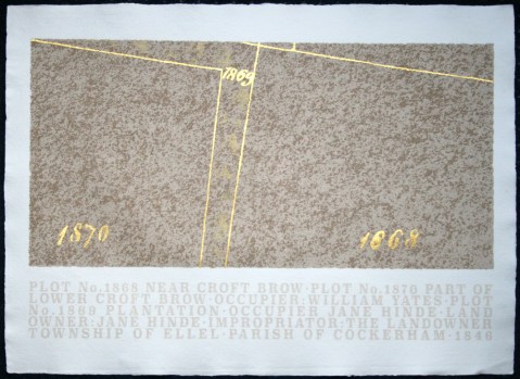 Previous Image Next Image Township of Ellel. 1846. Plot Nos. 1868,1869,1870 Township of Ellel. 1846. Plot Nos. 1868, 1869, 1870 Screen-printed in mud and gold acrylic, plus hand-painted gold. 56x76cm Khadi paper White 320g Rough 2024